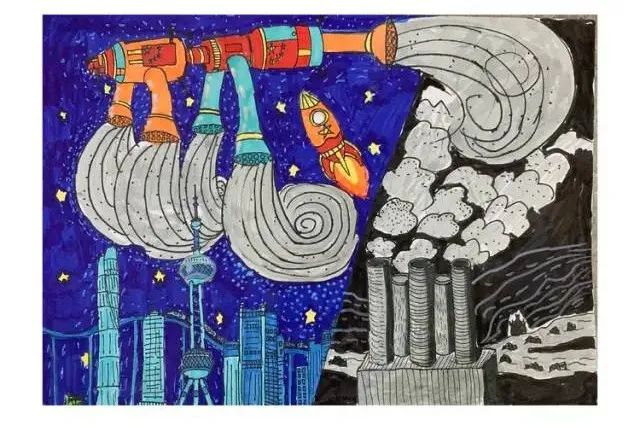 项萧云同学获奖作品绘画灵感来源:“随着工业的发展,城市的上空总是漂浮着各种污染气体,幻想通过未来科技手段达到快速清理污染物。”