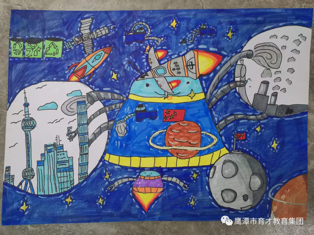 徐寅灏同学绘画灵感来源:“通过画面中的平行宇宙告诫我们要保护环境,因为只有这样才能拥有更加美好的生活。”